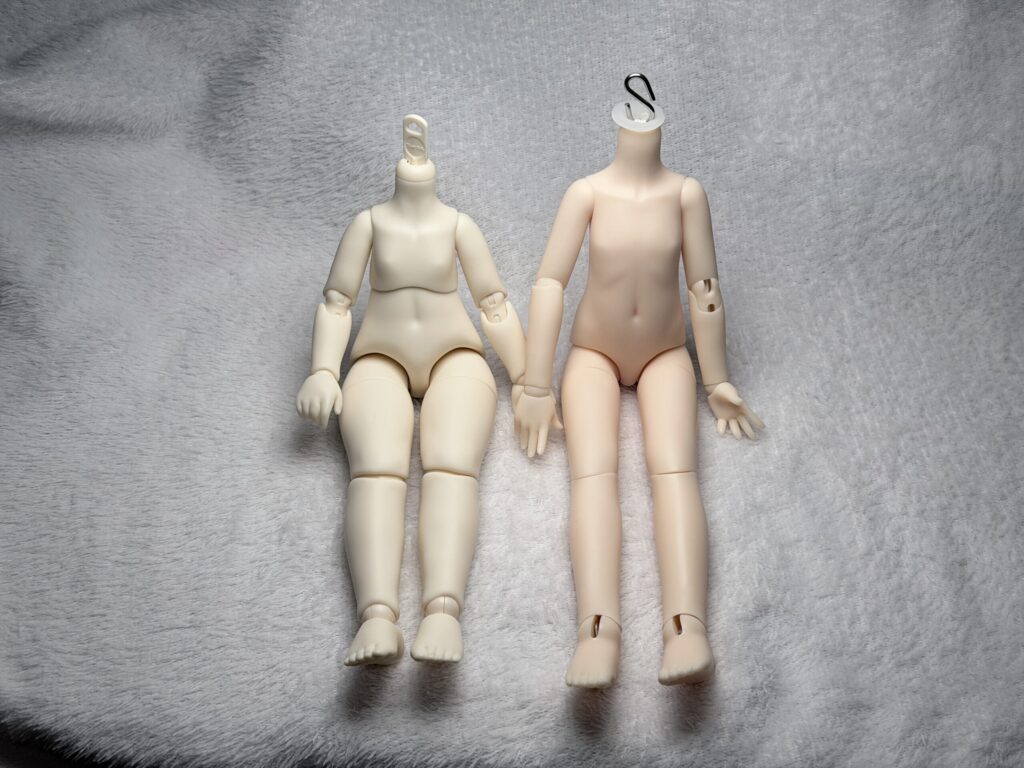 同じ1/6スケールのドールボディの中で較べてみると、天使体は小さい方。へちま体は手足ともスラリと長くて、お姉さんタイプの体形。どちらも「よく動く可動性の高いドール」ですが、内部構造と素材がまったく違うので、触り心地やメンテナンス、遊び方の方向性も変わってきます。それぞれの特性をすこしだけご説明しますね。
