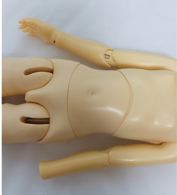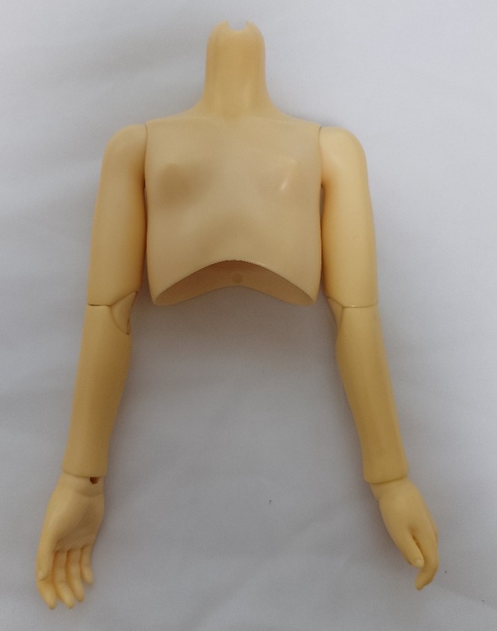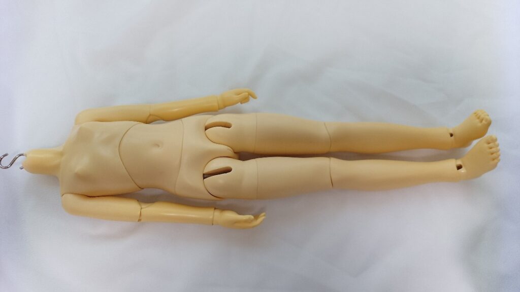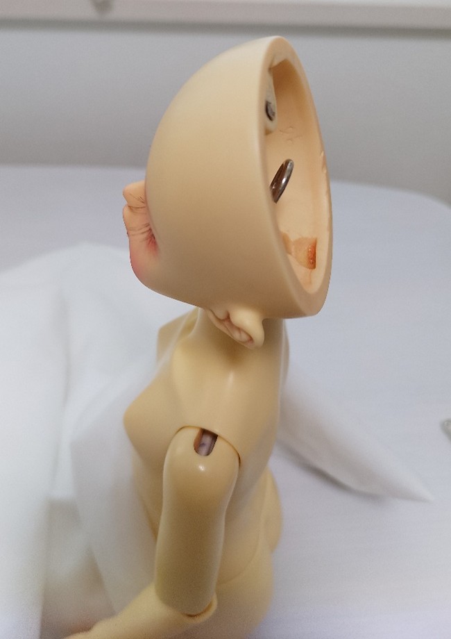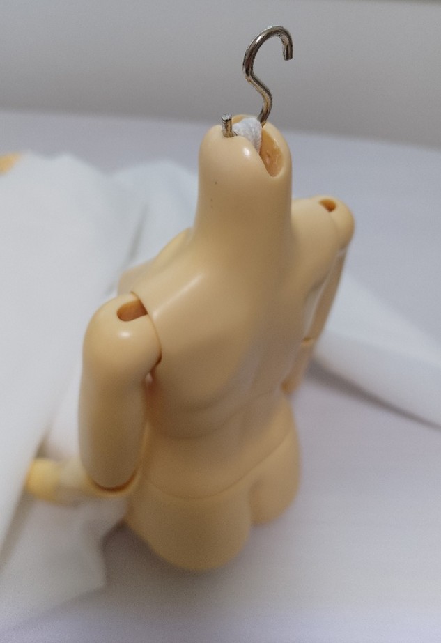まず、ドールのヘッドを外します。ヘッド内部のS字フック(またはネックパーツ)を確認し、テンションゴムを引きあげるように引っ張ります。
