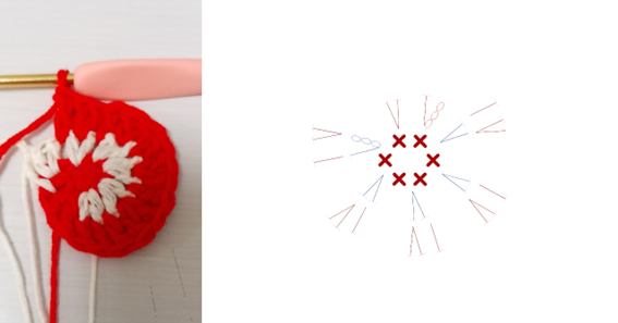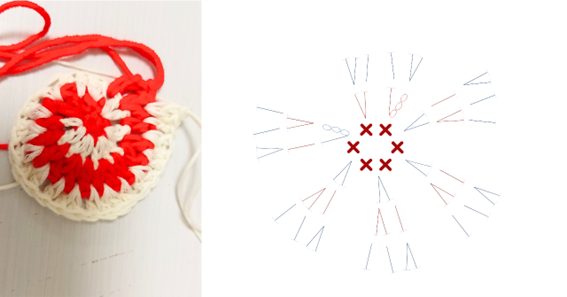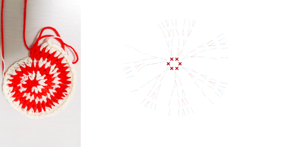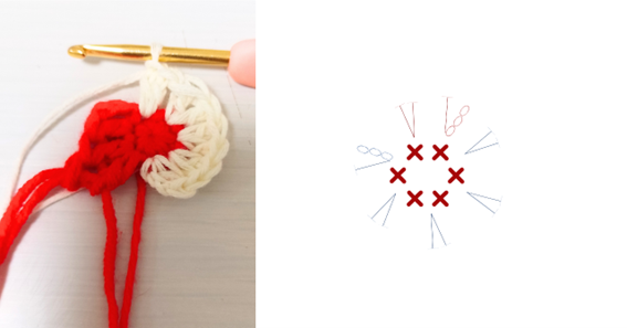 【1】中心の輪をつくり細編みから