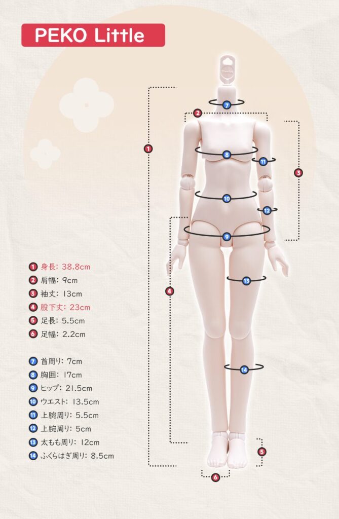 「PEKO Little」は従来のドール市場に置いてヘッド含めての高さ43㎝~45㎝ドールのニーズを考え計画された素体バリエーションです。「PEKO」と比べて股下丈が24㎝から23㎝(足を含めて25㎝→24㎝)、数値上の差異はわずかに1cm減らしただけのようですが、より幼くかわいい雰囲気が演出できるのです。ドールのサイズはつまり人間の縮尺でいうところでは、ドールの身長差1cmは実際の人間の身長差ではおよそ5cmほどの身長差にも感じられるのでは。